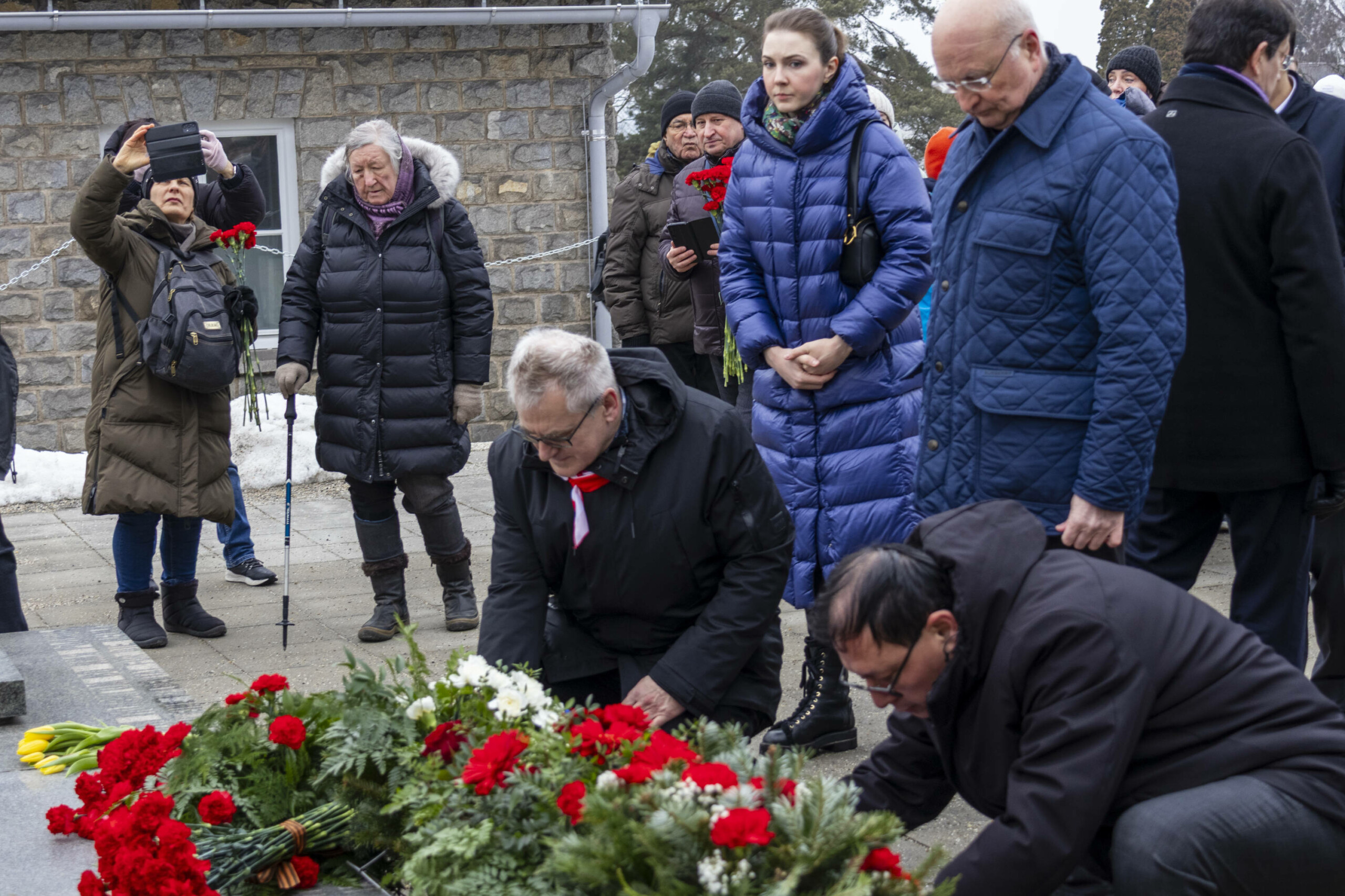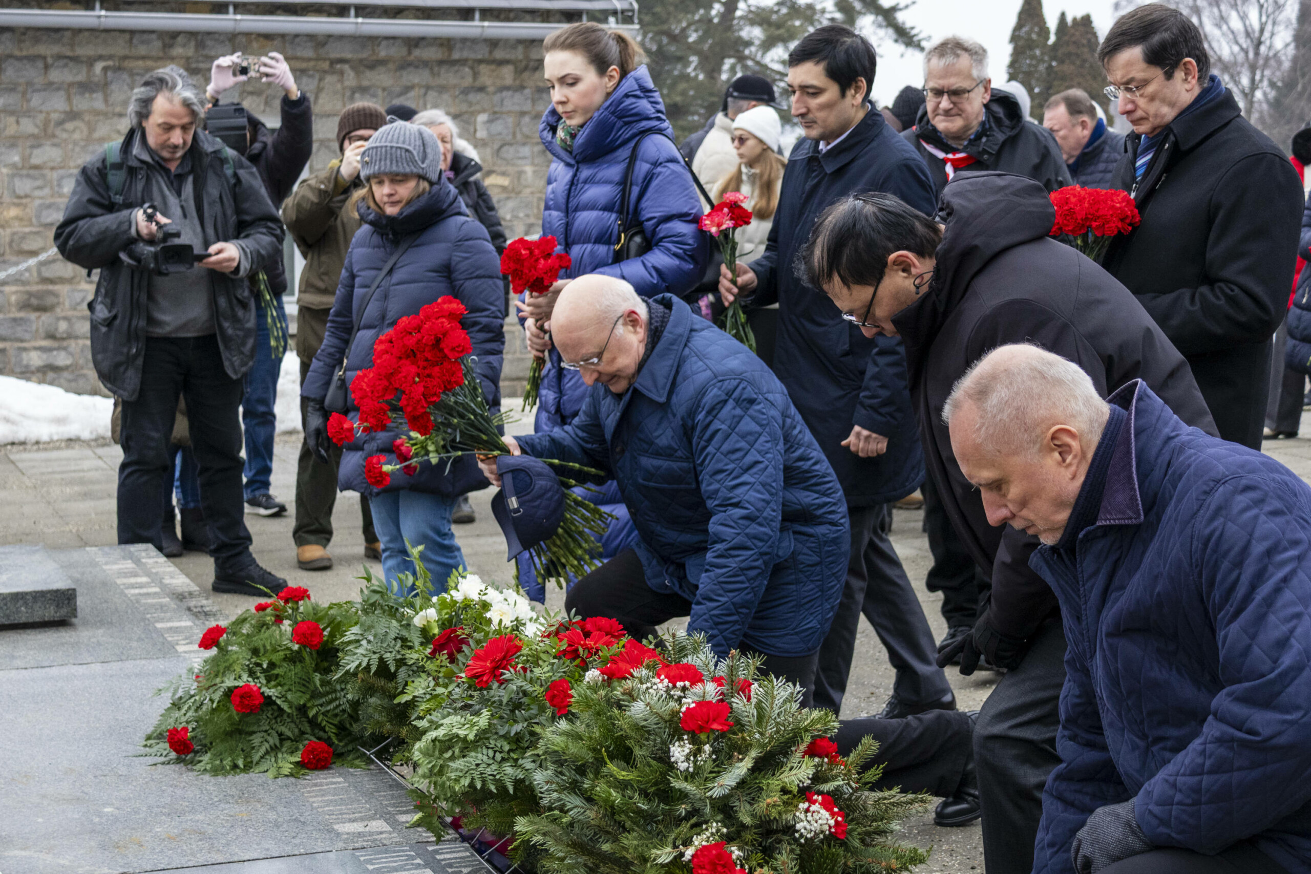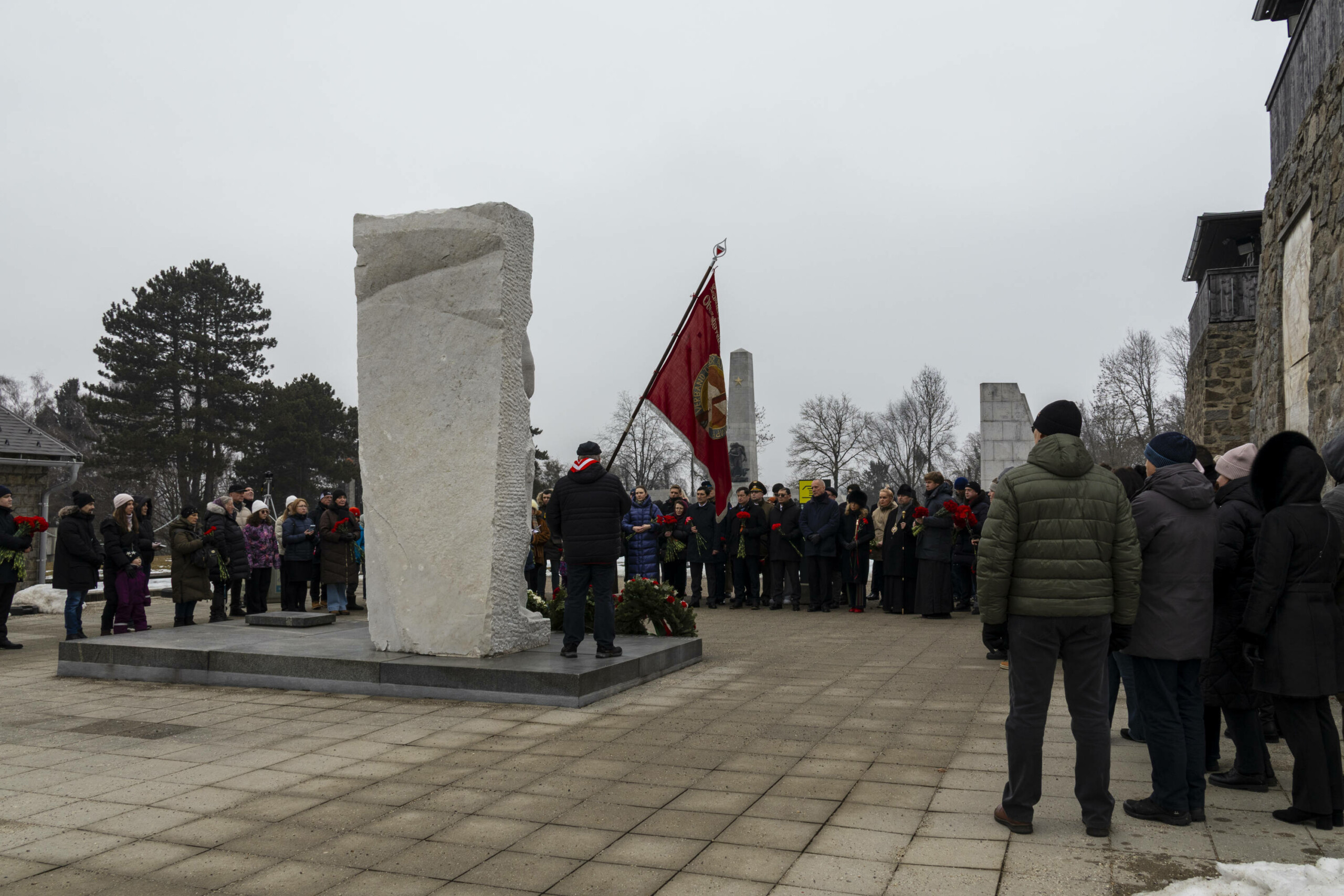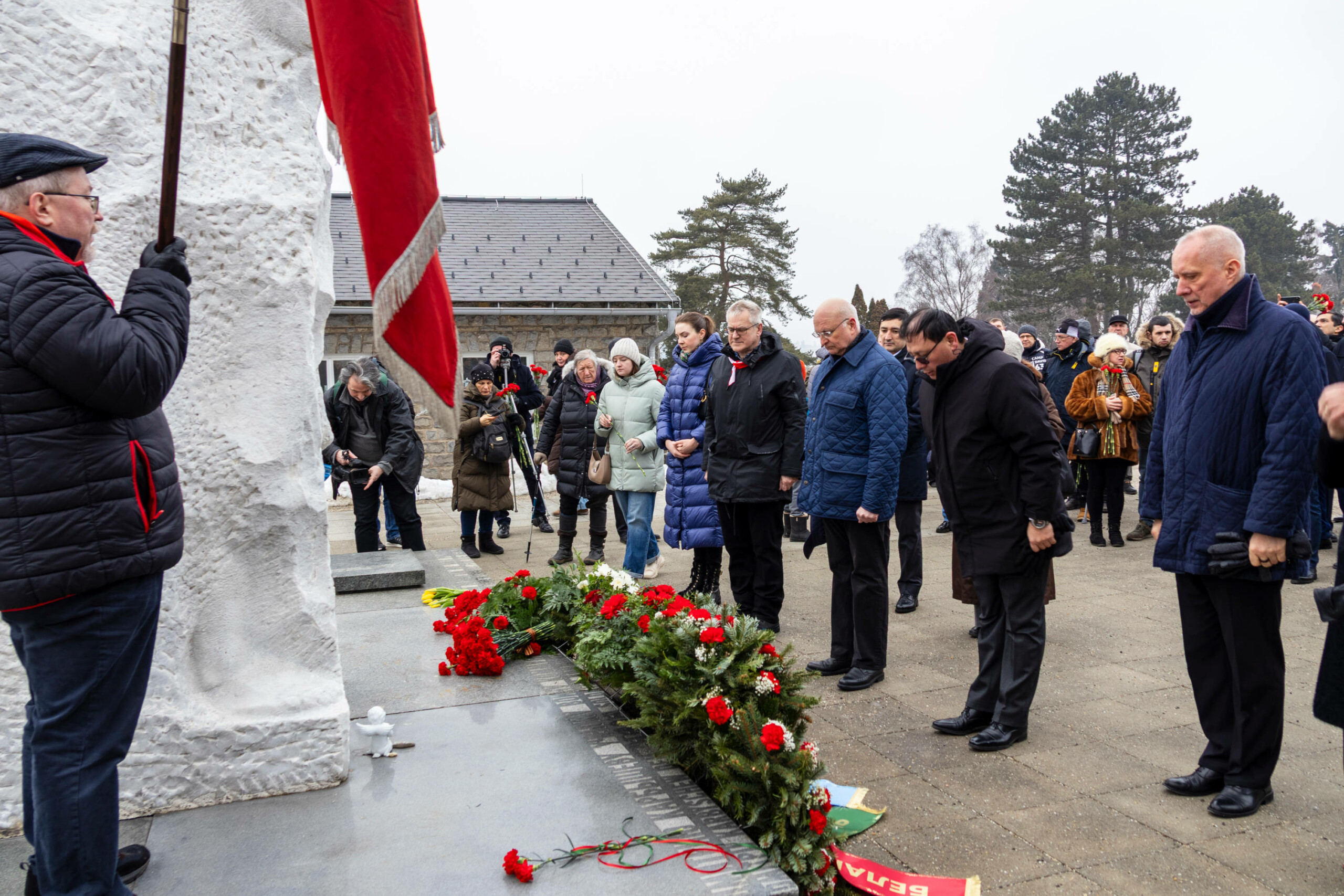 Die Kranzniederlegungen begannen beim Denkmal für Generalleutnant der Roten Armee, D.M. Karbyschew vor dem Lagertor. Der neue Botschafter der Russischen Föderation in Österreich, Andrej Jurjewitsch Grosow, erinnerte in seiner Begrüßung an die unmenschlichen Verbrechen des Hitlerfaschismus, an die Notwendigkeit eines entschlossenen Widerstands gegen jegliche Formen der Verherrlichung des Nazismus.